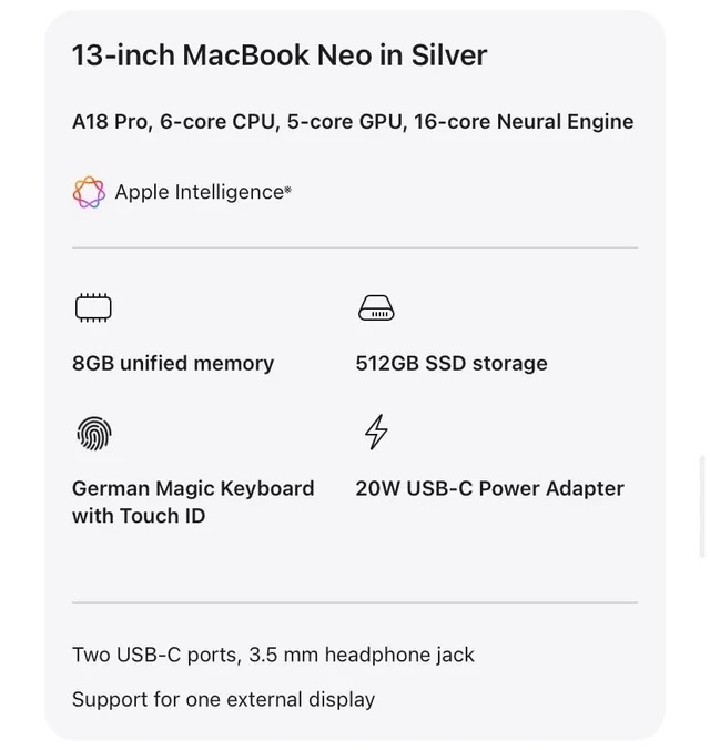 MacBook Neo 最大賣點就是用上 A18 Pro 晶片(6 核心 CPU:2 效能 + 4 效率,5 核心 GPU,16 核心 Neural Engine),這是 Apple 首次在 Mac 上採用 iPhone 等級的手機 SoC,而非 M 系列。