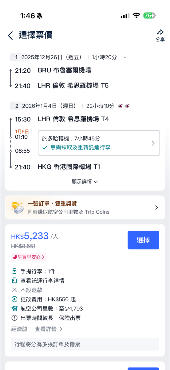 轉機神技:選擇經 阿聯酋、多哈、新加坡、首爾或台北轉機的航班,票價可比直飛低25-40%。例如,倫敦飛香港經多哈,票價可從HK6,463降至HK$5,233。避開熱門城市如東京/曼谷,改飛沖繩、胡志明市等,聖誕熱搜新興地,票價更親民。