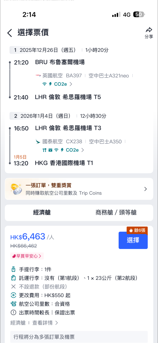 | 3. 多網站比價 | 同時查Expedia、Trip.com、國泰官網。輸入促銷碼(如Trip.com 8% off)。 | 省15% | Kayak多引擎搜尋 |